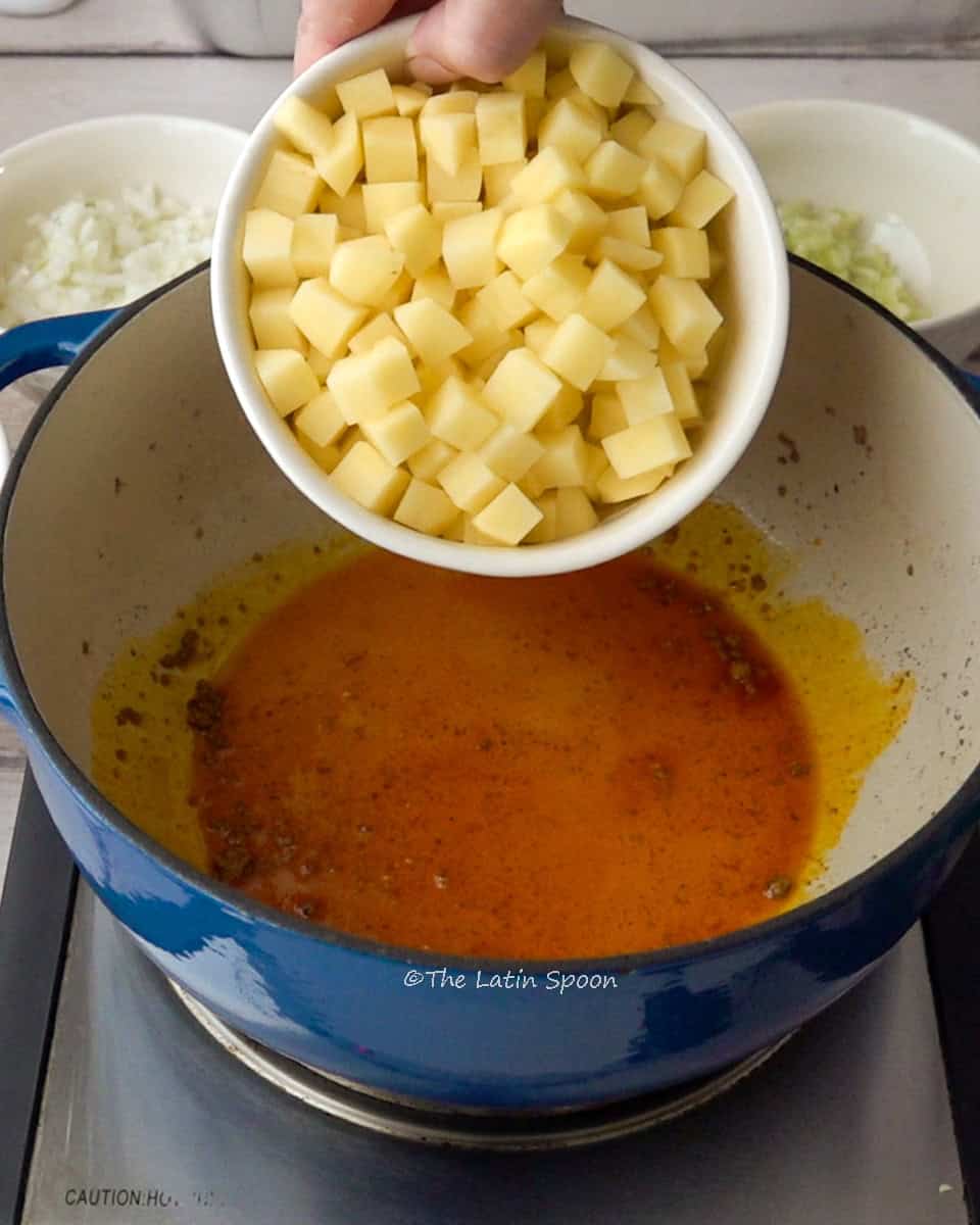 In the same pot, add the achiote paste and oil. Stir until the achiote dissolves and releases its color. Then add the potatoes and cook for 2 more minutes.