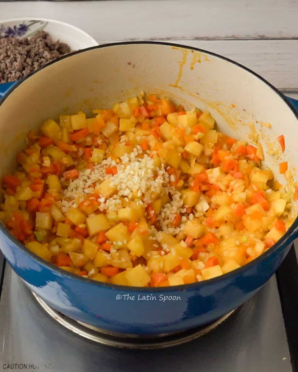 - In the same pot, add achiote paste and oil. Stir until melted and colored with red. Add potatoes, carrots, garlic, onion, celery, and bell pepper. Cook for about 3–4 minutes, stirring occasionally, until the vegetables start to soften.