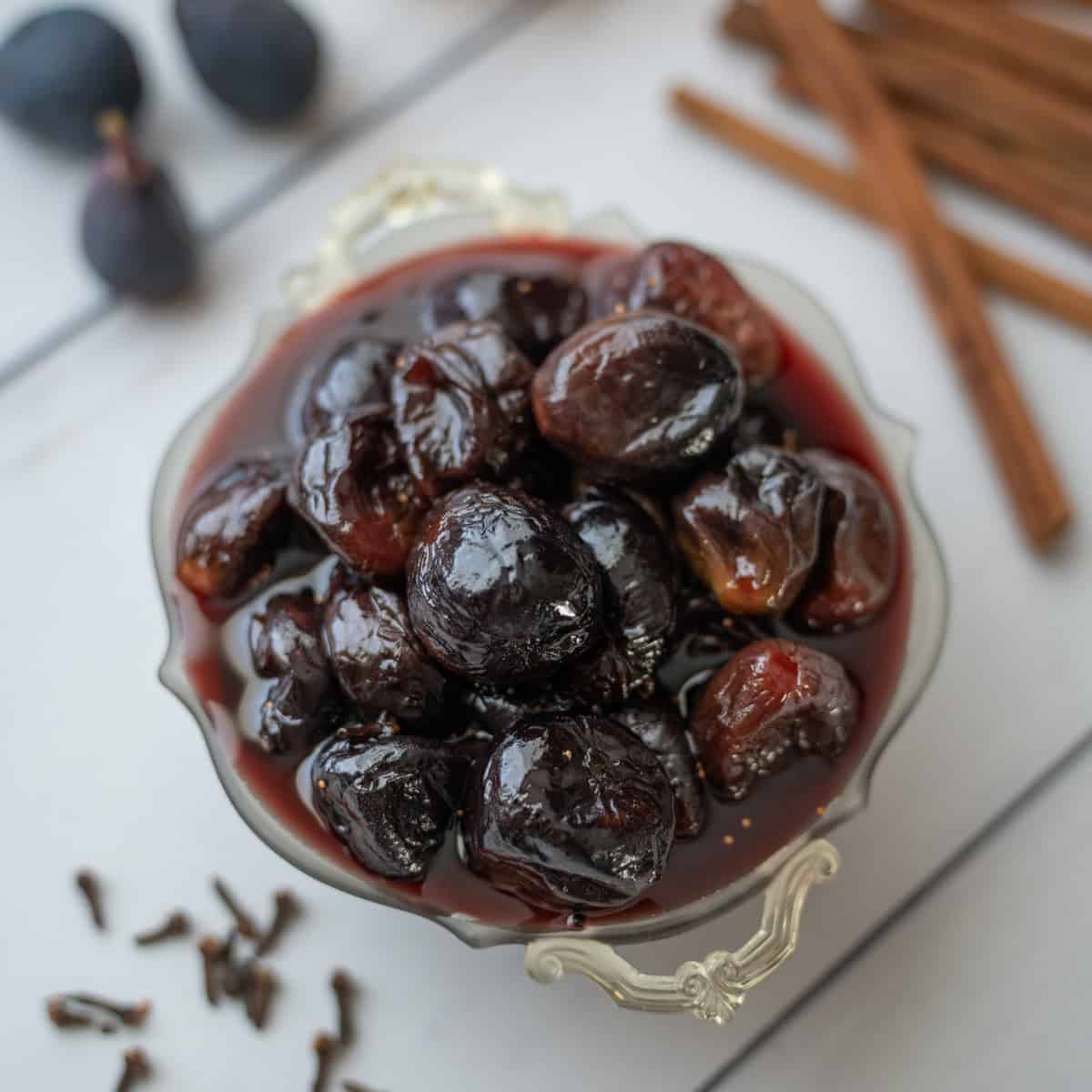 Remove the figs from the pot and boil the syrup by itself for about 5 minutes, or until it thickens to your liking. Strain the syrup to remove the cinnamon sticks, lemon rind, and cloves, then pour the syrup back over the figs.